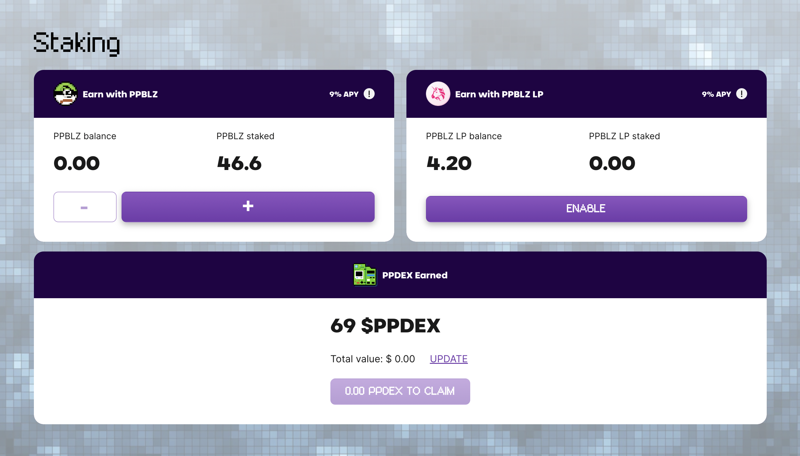 Stake your PPBLZ LP tokens and be proud of making Pepemon DeFi possible and earning double the amount of PPDEX rewards.